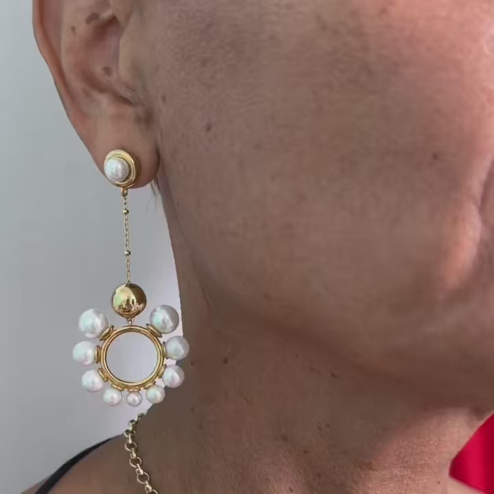 • These gold pearl hoop earrings are made of ethically mined 23.5-karat yellow gold premium plating and white pearls